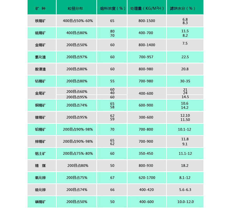 目前已廣泛應用于銅、鐵、金、銀、錫、鋁、鉛、鋅、鎳、鈷、鈀、鉬、鉻、銘、 硫、磷、煤、硅、石英、云母、錫土等精礦、尾礦脫水、化工行業氧化鋅、氧化鉛、硫化鋅、電解渣、浸出渣、爐渣 的脫水及環保污水泥廢酸處理等。物料細度從-200到-450目以及各種超細物料。