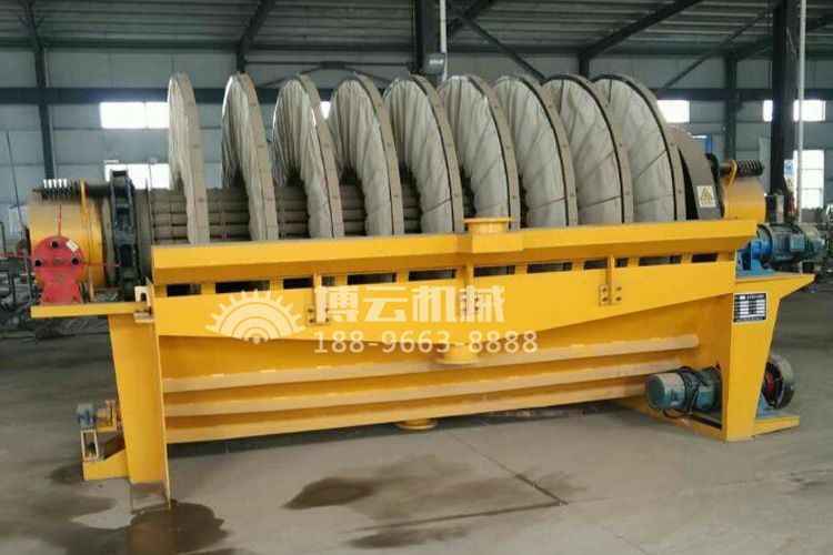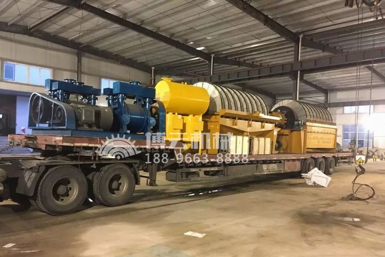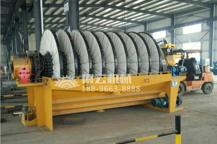 盤式真空過濾機由各個單獨的扇形片的圓盤構成。每一個扇形片為單獨的過濾單元,由濾布做成布套在扇形片上形成濾室。過濾盤由電機通過減速器及開式齒輪傳動來驅動,過濾盤順時針方向轉動,濾室里的礦漿在吸附區借助于真空泵在過濾介質兩側形成的壓力差,附著在過濾盤上形成濾餅后,攪拌器旋轉防止固體沉淀,濾餅離開液面后,在真空作用下繼續脫去水分。濾液透過濾布,經過濾液管,從分配頭排出。濾餅在卸料區由反吹風卸料落入排料槽,整個作業過程連續循環進行。