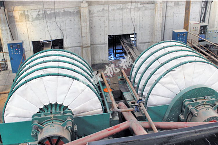 盤式真空過濾機(jī)由各個單獨(dú)的扇形片的圓盤構(gòu)成。每一個扇形片為單獨(dú)的過濾單元,由濾布做成布套在扇形片上形成濾室。過濾盤由電機(jī)通過減速器及開式齒輪傳動來驅(qū)動,過濾盤順時針方向轉(zhuǎn)動,濾室里的礦漿在吸附區(qū)借助于真空泵在過濾介質(zhì)兩側(cè)形成的壓力差,附著在過濾盤上形成濾餅后,攪拌器旋轉(zhuǎn)防止固體沉淀,濾餅離開液面后,在真空作用下繼續(xù)脫去水分。濾液透過濾布,經(jīng)過濾液管,從分配頭排出。濾餅在卸料區(qū)由反吹風(fēng)卸料落入排料槽,整個作業(yè)過程連續(xù)循環(huán)進(jìn)行。