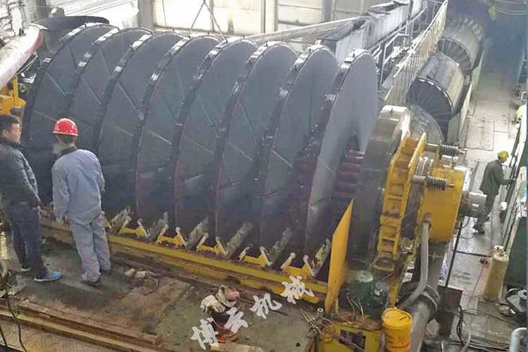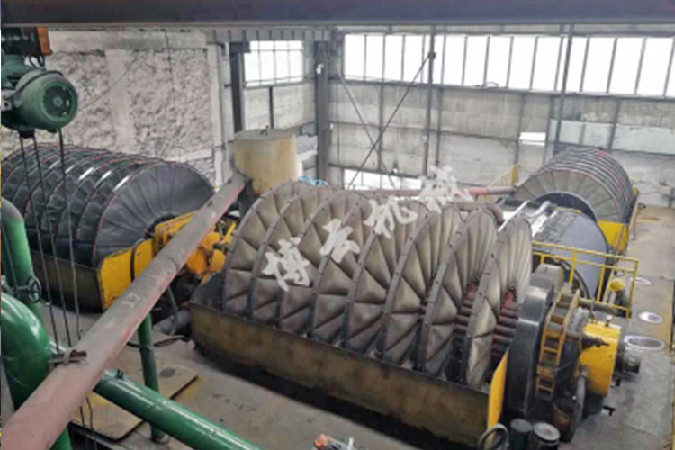 盤式真空過濾機由各個單獨的扇形片的圓盤構成。每一個扇形片為單獨的過濾單元,由濾布做成布套在扇形片上形成濾室。過濾盤由電機通過減速器及開式齒輪傳動來驅動,過濾盤順時針方向轉動,濾室里的礦漿在吸附區借助于真空泵在過濾介質兩側形成的壓力差,附著在過濾盤上形成濾餅后,攪拌器旋轉防止固體沉淀,濾餅離開液面后,在真空作用下繼續脫去水分。濾液透過濾布,經過濾液管,從分配頭排出。濾餅在卸料區由反吹風卸料落入排料槽,整個作業過程連續循環進行。